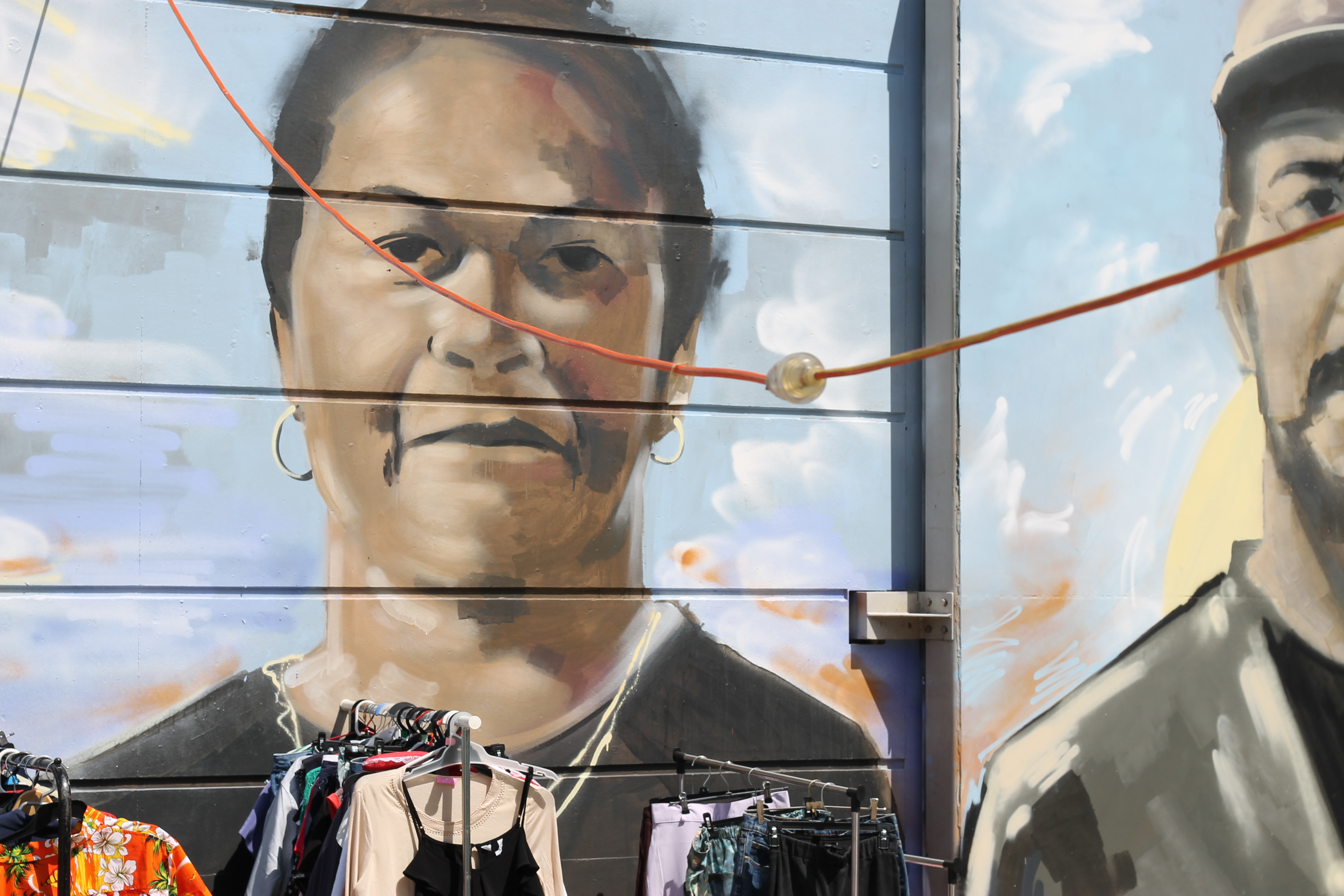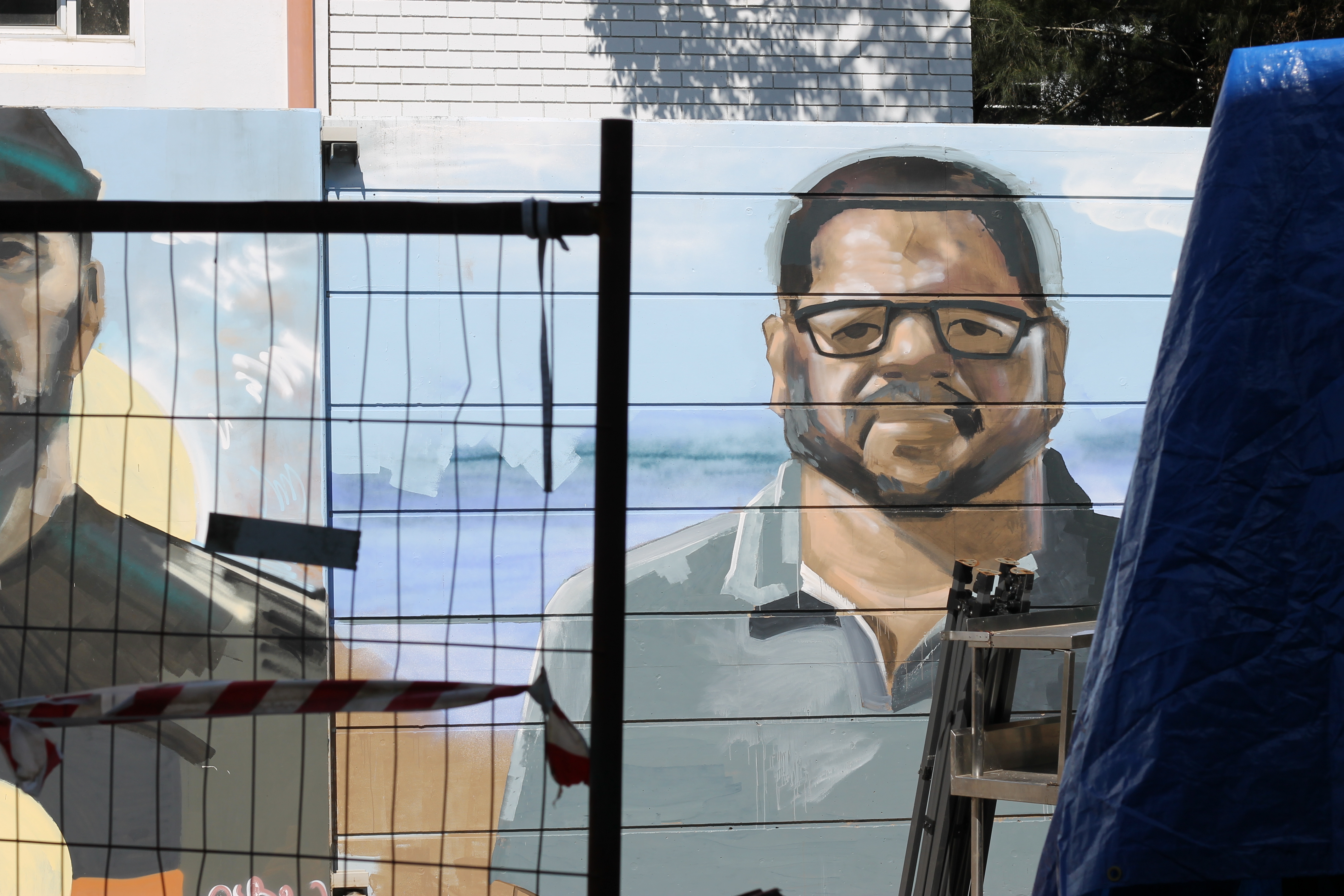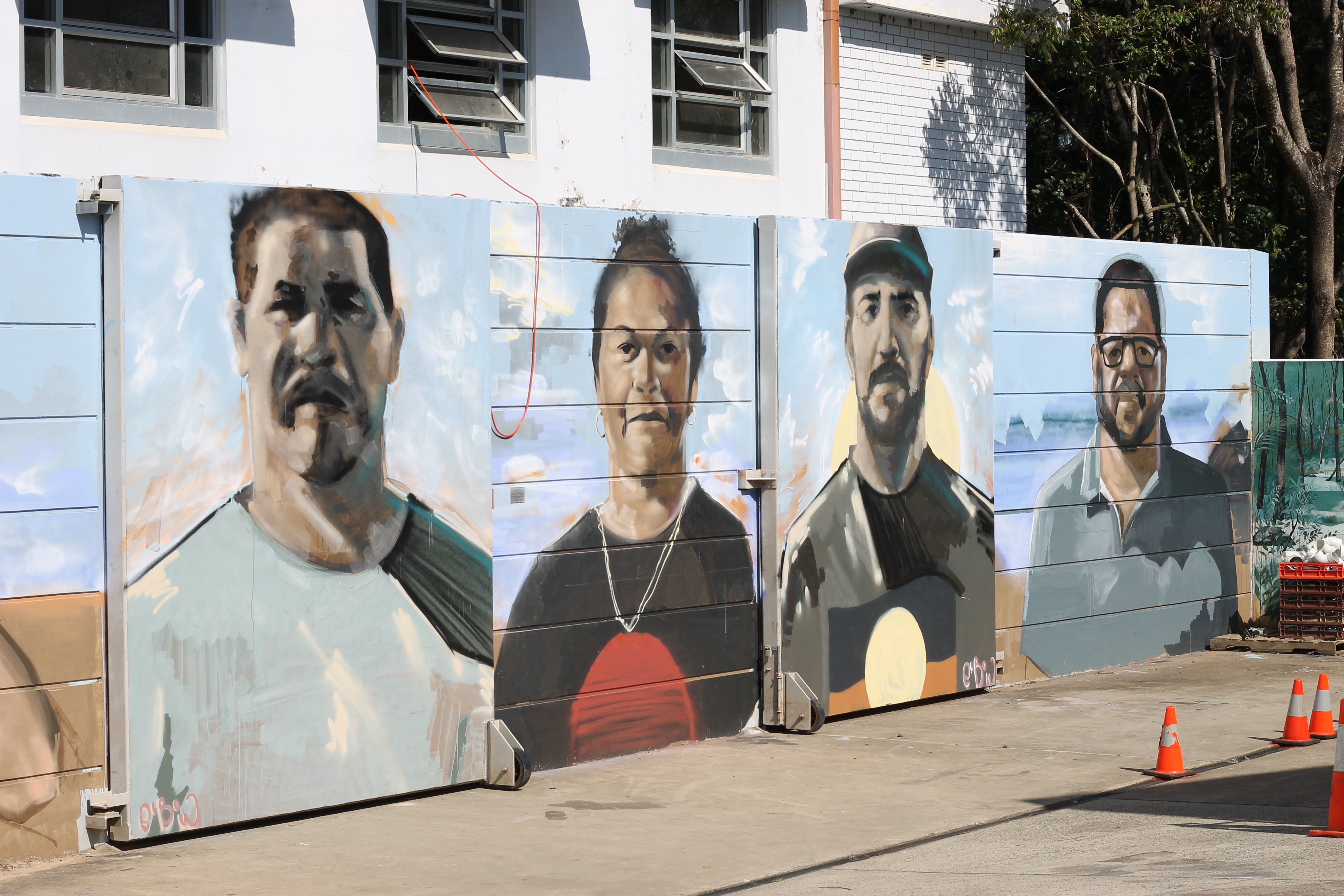 Murals on the Koori Mail headquarters building, depicting portraits of Bundjalung Elders and community members after the Lismore floods.